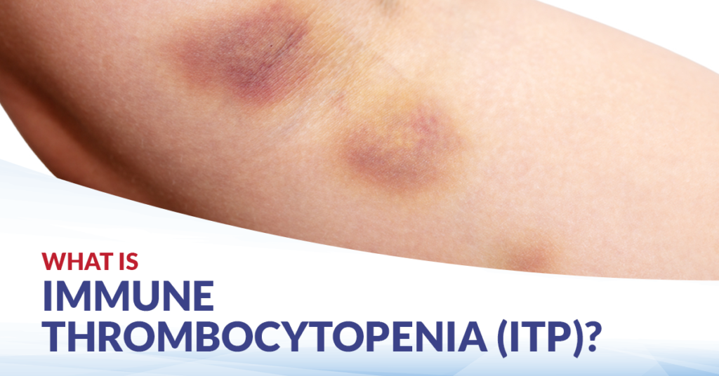 ITP dahulu dikenal sebagai IDIOPATHIC (~ penyebab tidak diketahui) Thrombocytopenic Purpura (bercak perdarahan di bawah kulit akibat menurunnya jumlah Trombosit). Namun sekarang dikenal dengan nama Immune Thrombocytopenia karena fokusnya pada gangguan auto-immune yang merusak Trombosit sehingga terjadi penurunan jumlah Trombosit yang ada di darah. Dampaknya adalah dapat terjadi perdarahan spontan yang tampak di bawah kulit, yang jaman dahulu di masyarakat umum dijuluki penyakit ‘dijilat setan’ karena saat bangun tidur ditemukan kebiruan tanpa didahului trauma benturan apapun.